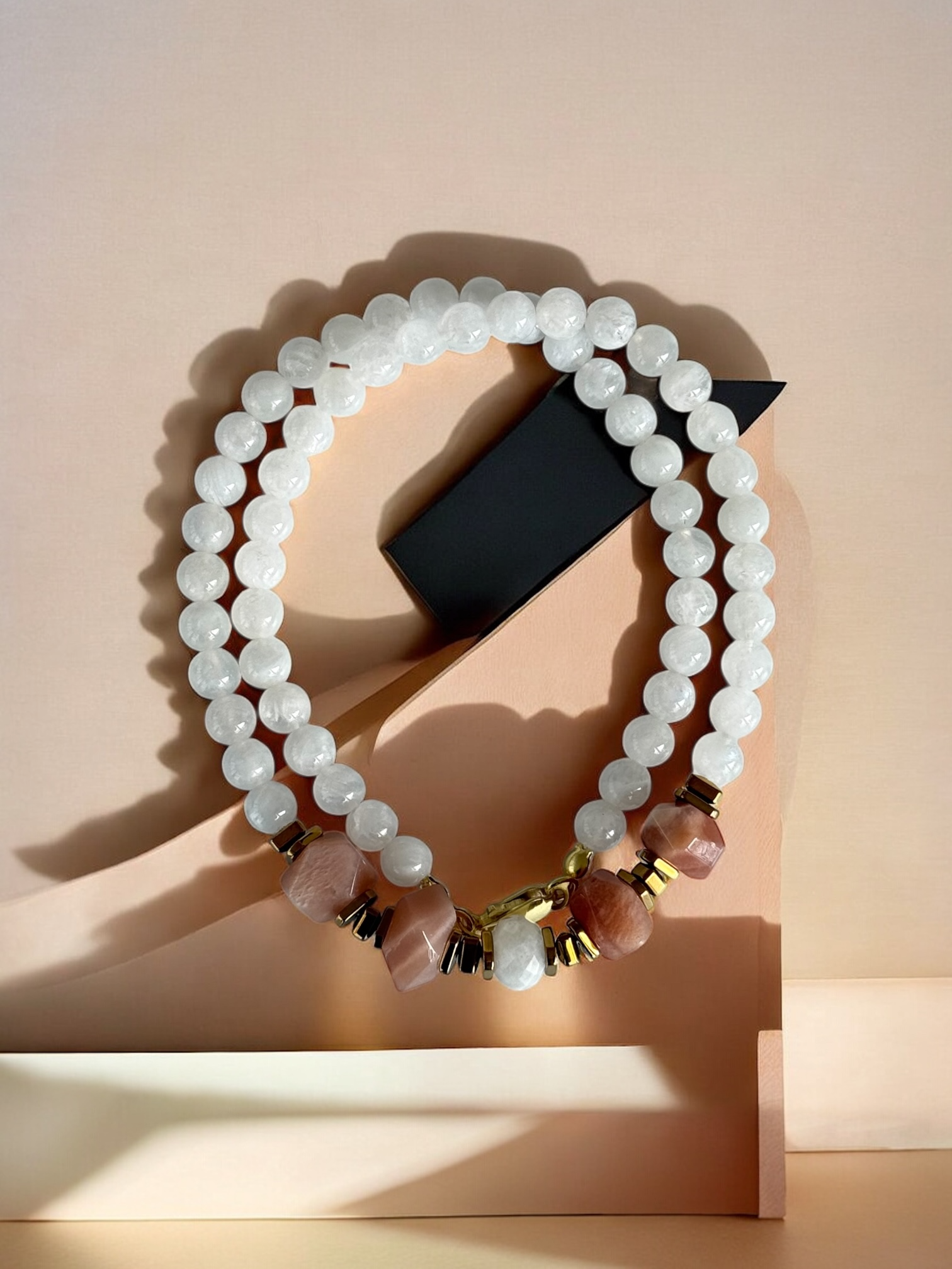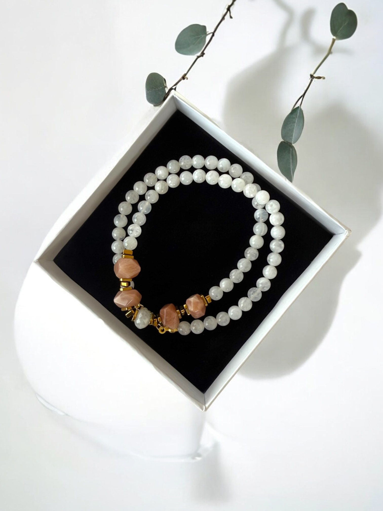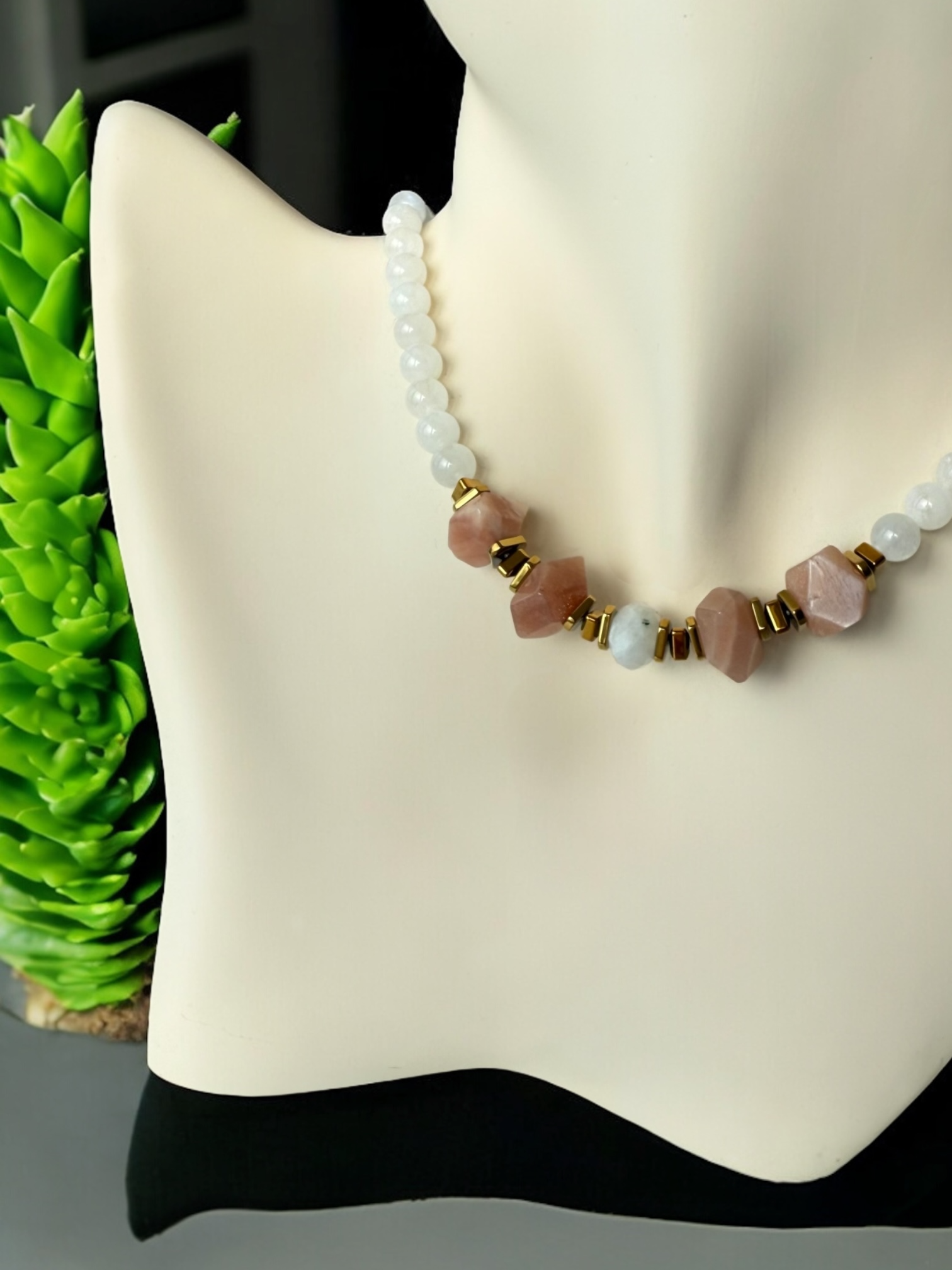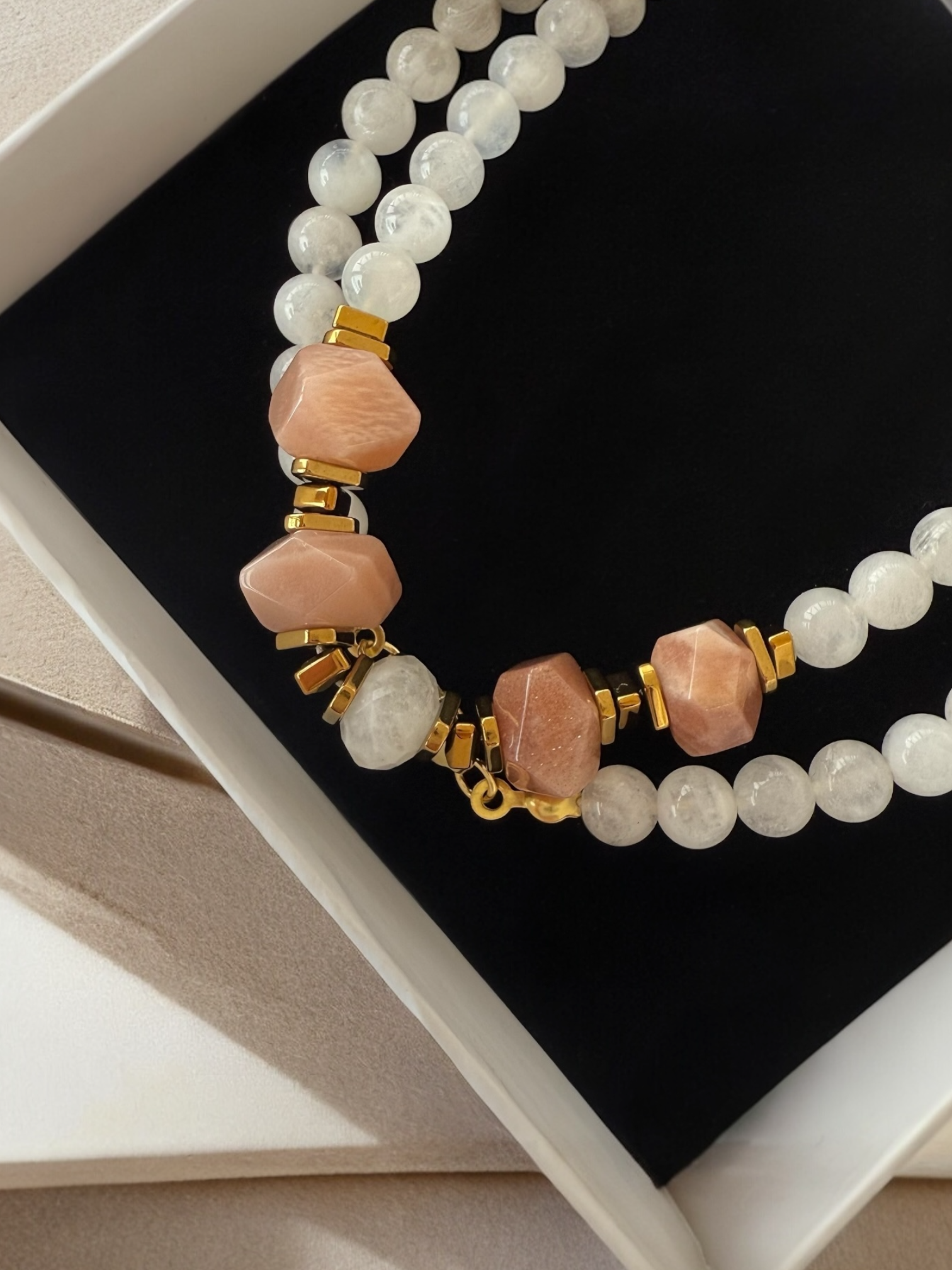Ortalama 6 mm ölçülerinde orijinal Ay taşları ve amorf formda 10-11 mm Güneş Taşları ile hazırlanmıştır.