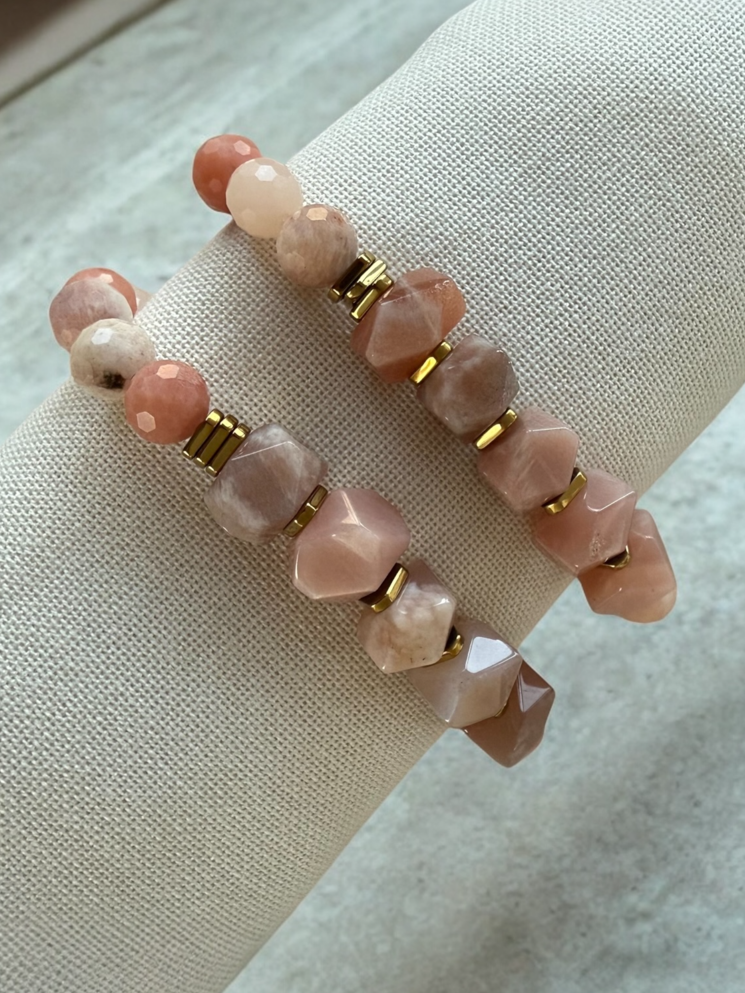 8 mm ölçülerinde mat - küre kesim Güneş Taşları ile rondela amorf kesim ortalama 12 mm ölçülere sahip Güneş Taşları ile tasarlanmıştır.