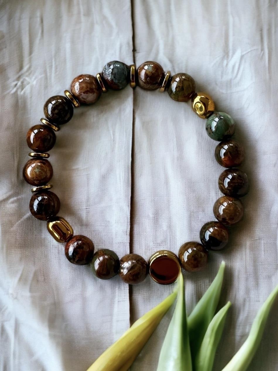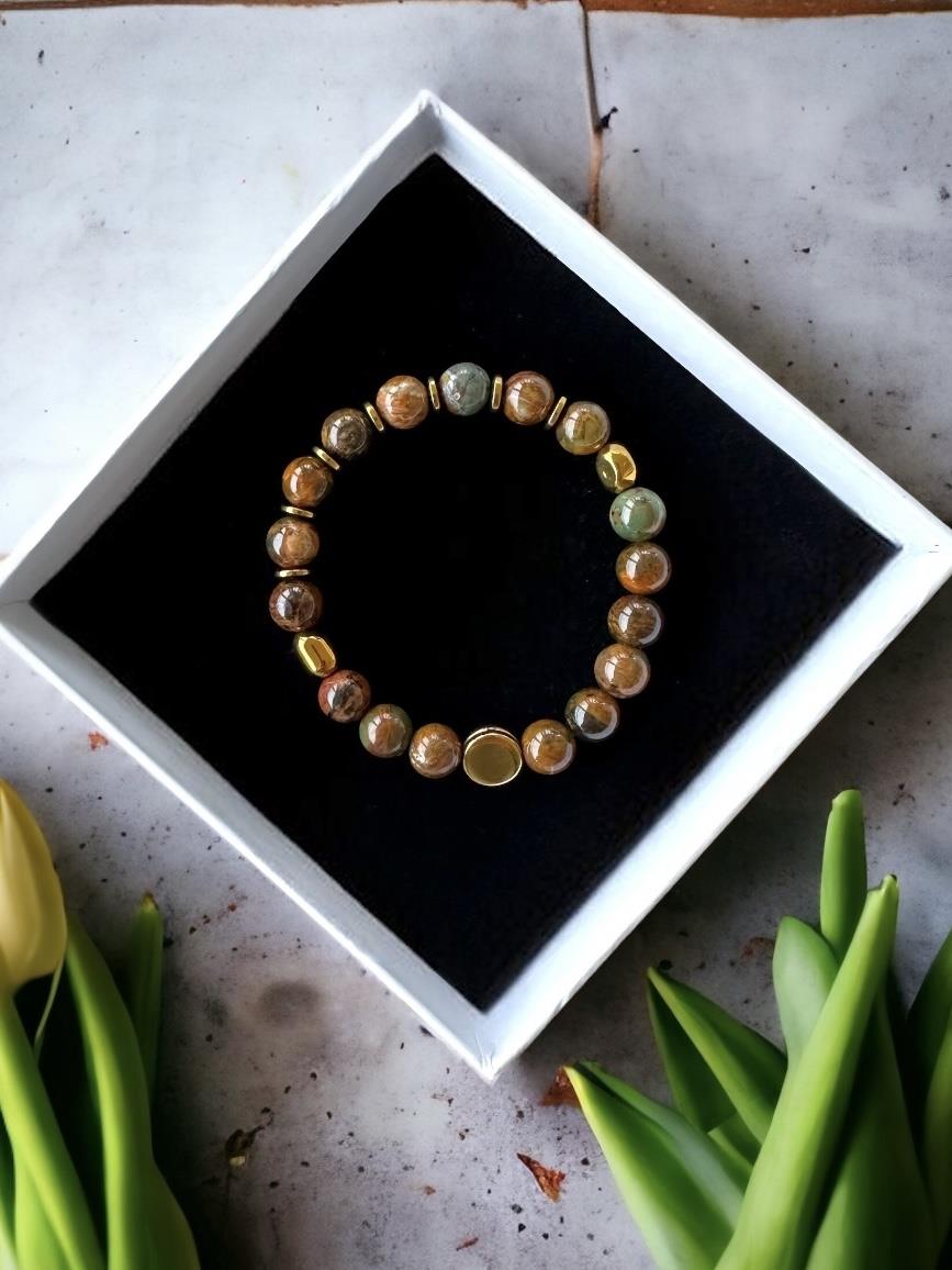 8 mm ölçülerinde orijinal ve birinci sınıf kalitede toprak tonların hakim olduğu Krizopras Taşları ile hazırlanmıştır.