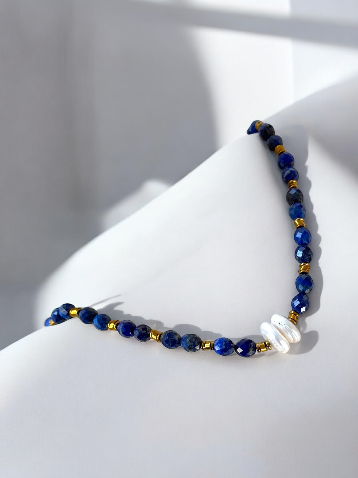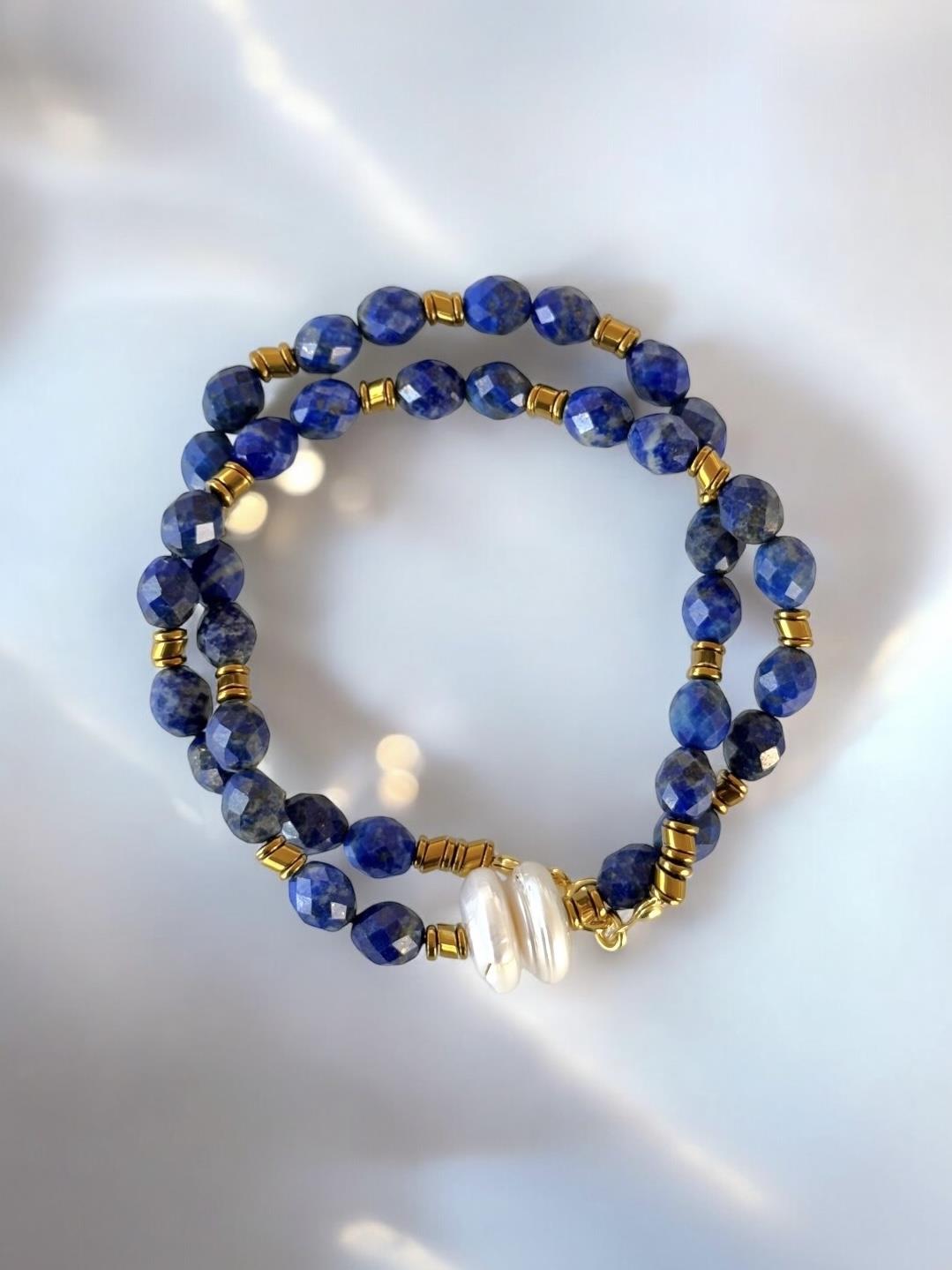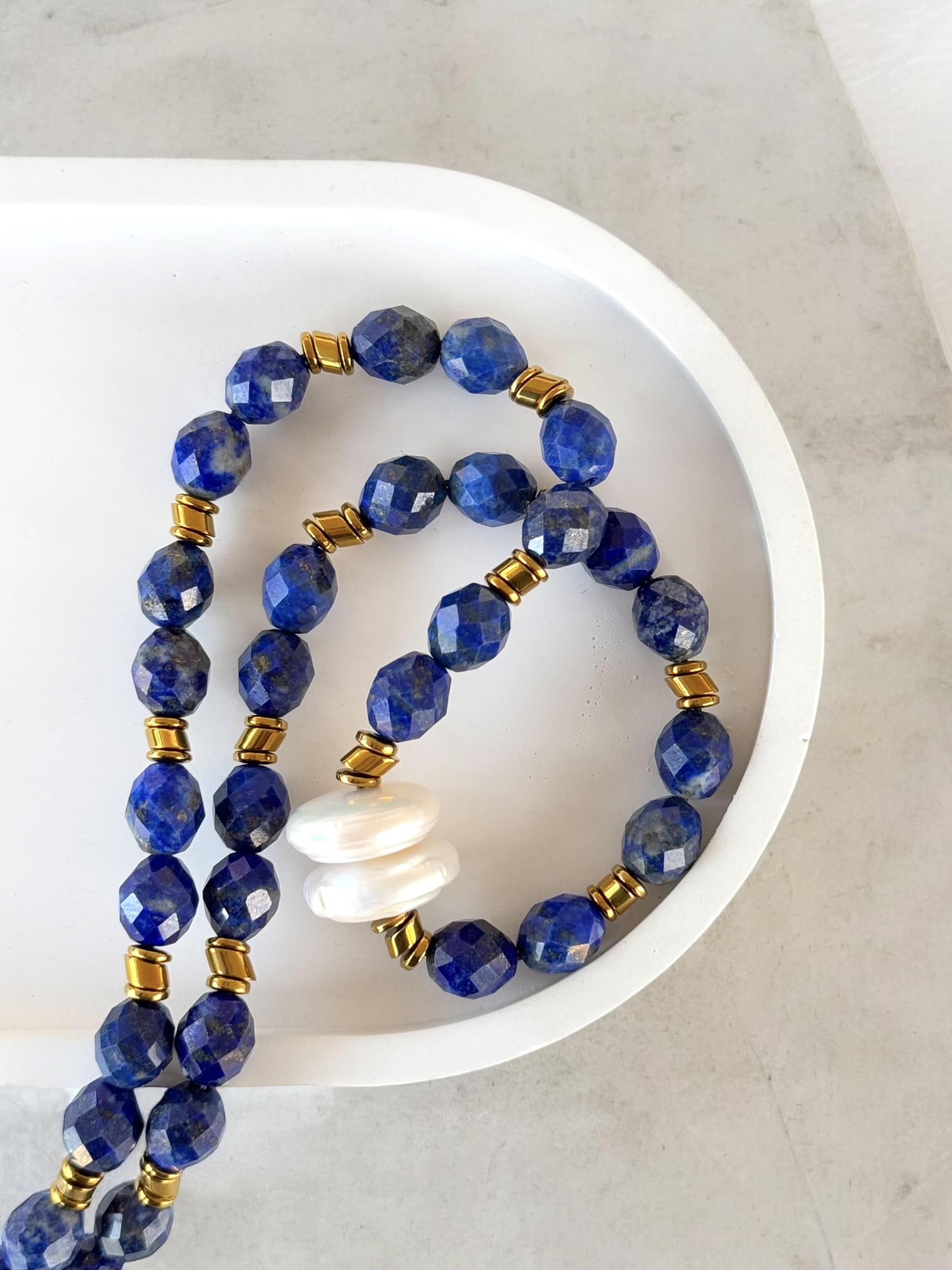 Ortalama 8 mm badem form faset kesim Lapis Lazuli taşları ile hazırlanmıştır.